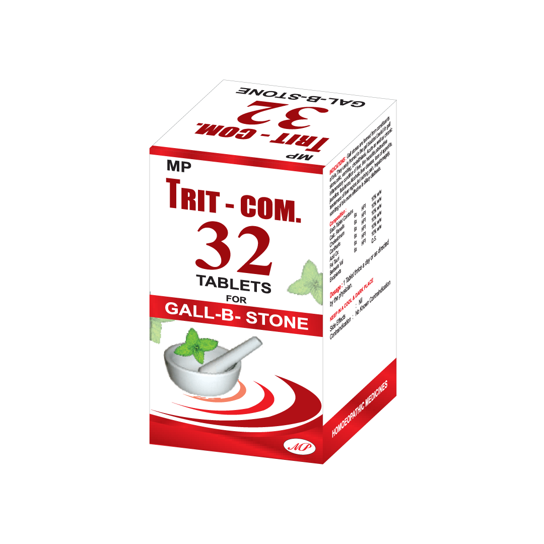 Indication: Trit Com 32 tablets is a safe remedy that helps relieve symptoms associated with gall stone and impaired bile secretion like pain in the abdomen, lack of appetite and flatulence.